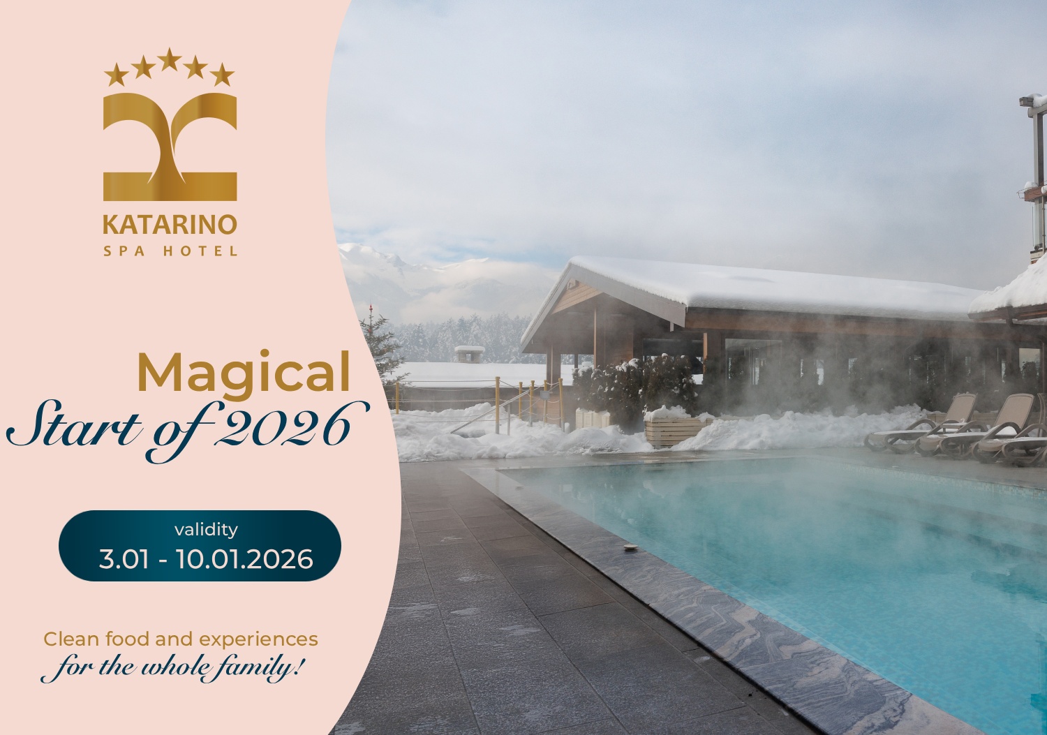- Free access to the thermal area in Katarino SPA Centre – indoor pool with healing mineral water with a temperature of 34 °C, jacuzzi cave, salt room, Finnish sauna, Kiva sauna, infrared sauna, aroma steam bath, panoramic steam bath, laconicum, adventurous showers, tepidarium, panoramic relaxation area with an open fireplace, ice fountain
