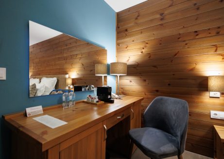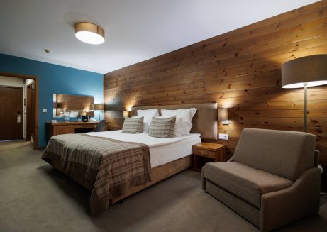 В двойните стаи ЛУКС можете да се насладите на уютно и практично пространство, допълнено от стилните детайли в обзавеждането, до акцентите от естествено тъмно дърво и елегантни мебели. Те не разполагат с балкон, но благодарение на южното си изложение, пред погледа на гостите се разкрива уникална гледка през панорамните прозорци. Избирайки Двойна стая Лукс, Вие избирате комфорт и уединение в сърцето на планината.